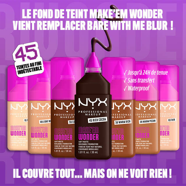 Découvrez le premier fond de teint NYX Professional Makeup effet flouté, Bare With Me Blur. Une couvrance moyenne et modulable, et un fini mat, disponible en 24 teintes, qui améliore l'apparence de votre peau. Formulé à base de glycérine, matcha et niacinamide, sa texture légère glisse sur la peau et laisse un fini flouté. Plus besoin de filtre beauté ! Formulé vegan*.