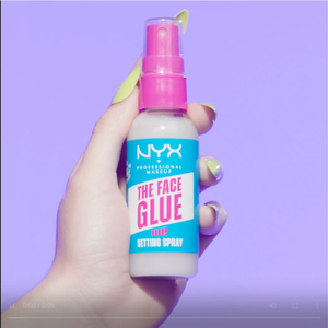 The Face Glue Setting Spray, le 1er spray fixateur de NYX Professional Makeup qui fixe votre maquillage et donne une sensation d’hydratation à votre peau jusqu’à 24h*, sans effet collant ni gras.