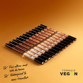 Formule fluide et légère sans transfert. Fini mat. Disponible en 24 teintes ultra-pigmentées.